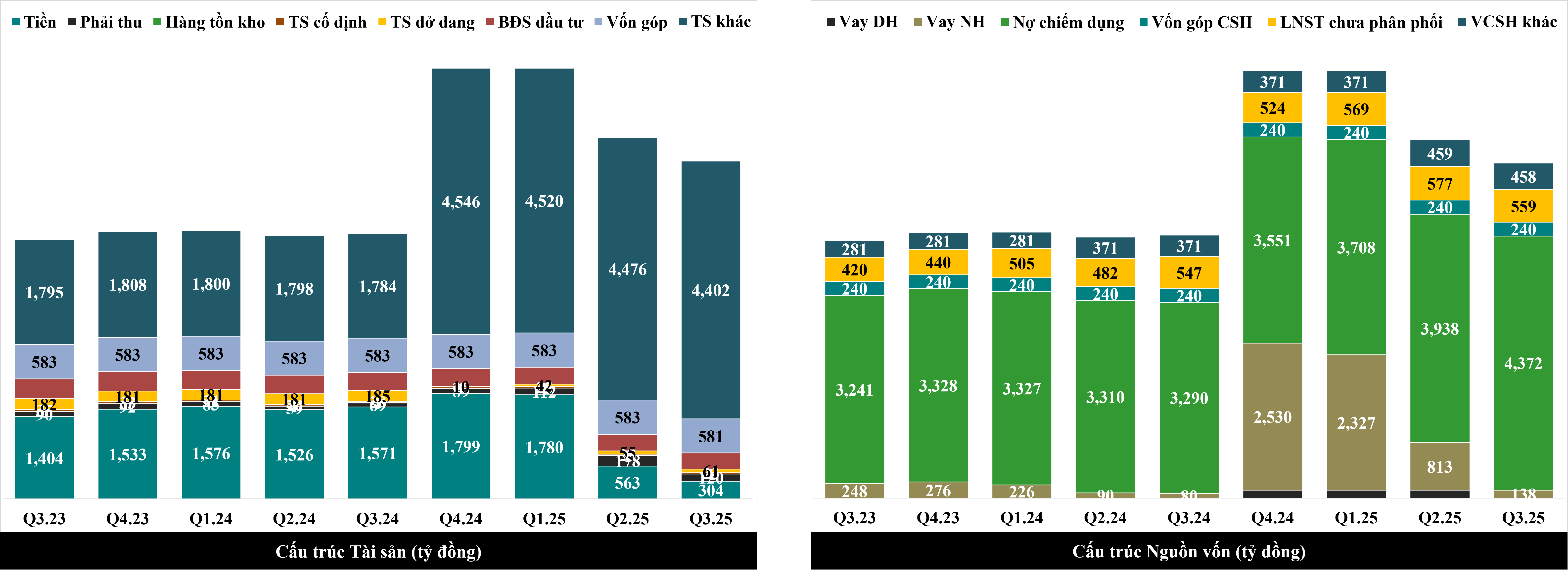 Bên cạnh việc ghi nhận doanh thu cho thuê 1 lần đối với 1 hợp đồng trong Q2.25 và 1 hợp đồng trong Q3.25, Kiên thấy rằng NTC vẫn tiếp tục ghi nhận doanh thu cho thuê phân bổ hàng năm. Vì số dư Doanh thu chưa thực hiện dài hạn cuối Q3.25 tăng mạnh gần 500 tỷ so với cuối Q2.25 lên mức 3,821 tỷ.