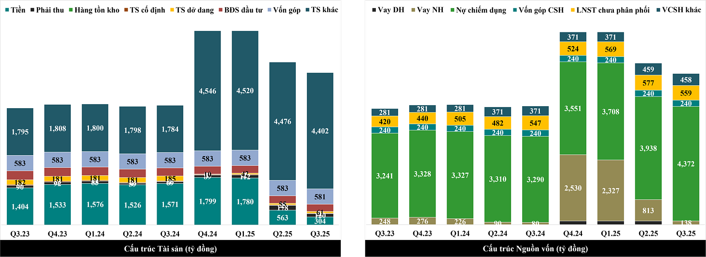Quay lại BCTC Q3.25, chúng ta sẽ thấy cuối quý này, Vay ngắn hạn phải trả lãi của NTC là 138 tỷ đồng, giảm 675 tỷ đồng từ mức 813 tỷ đồng ở cuối Q2.25. Vay NH giảm mạnh nhờ hợp đồng cho thuê mới trong quý + tiền giảm gần 260 tỷ. Với mức Vay NH còn lại ở mức thấp, NTC hoàn toàn có thể tích lũy lại lượng tiền mặt hơn 1,500 tỷ như giai đoạn trước ngay trong năm 2026.