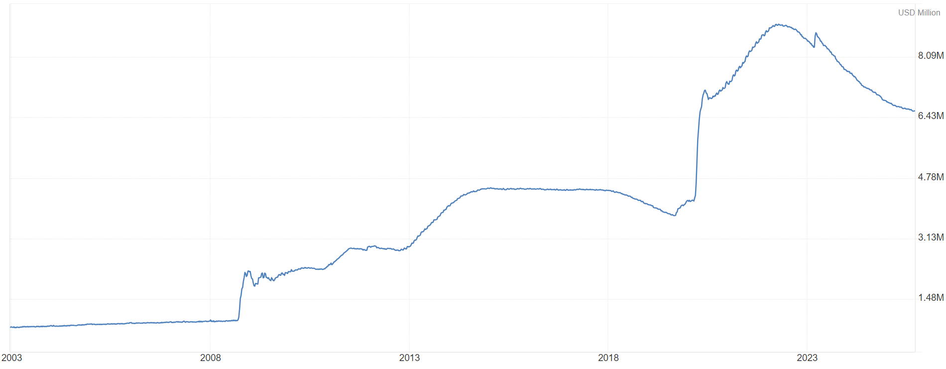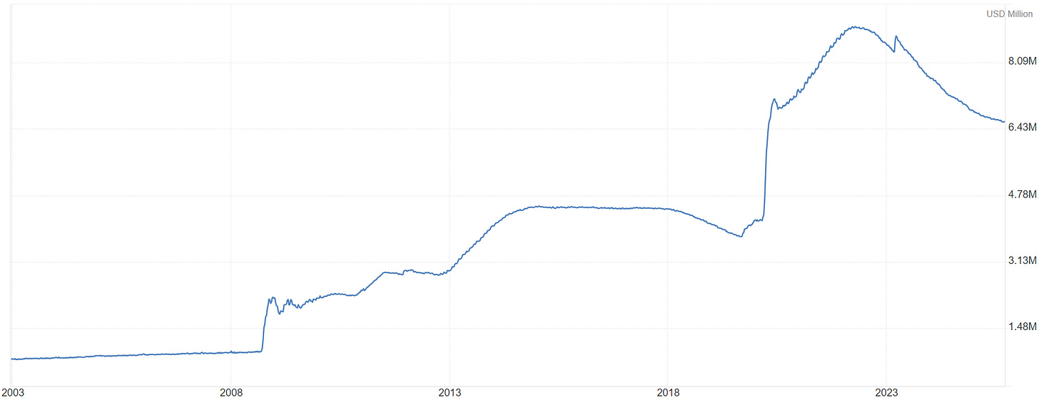 Chà, tôi nghĩ chúng tôi đang giảm quy mô bảng cân đối một cách khá nhẹ nhàng. Như ông biết, với bảng cân đối, chúng tôi vẫn đang ở trạng thái dự trữ dồi dào, và chúng tôi đã nói sẽ dừng ở trên mức “dự trữ đủ” một chút. Đó là nơi chúng tôi đang ở, và chúng tôi đang tiến gần điều đó. Chúng tôi theo dõi rất kỹ. Chúng tôi không nghĩ điều đó có tác động vĩ mô đáng kể. Đây là những con số khá nhỏ chuyển động trong một nền kinh tế khổng lồ. Mức chạy xuống không lớn. Vì vậy, tôi sẽ không gán các hệ quả vĩ mô cho việc đó lúc này.