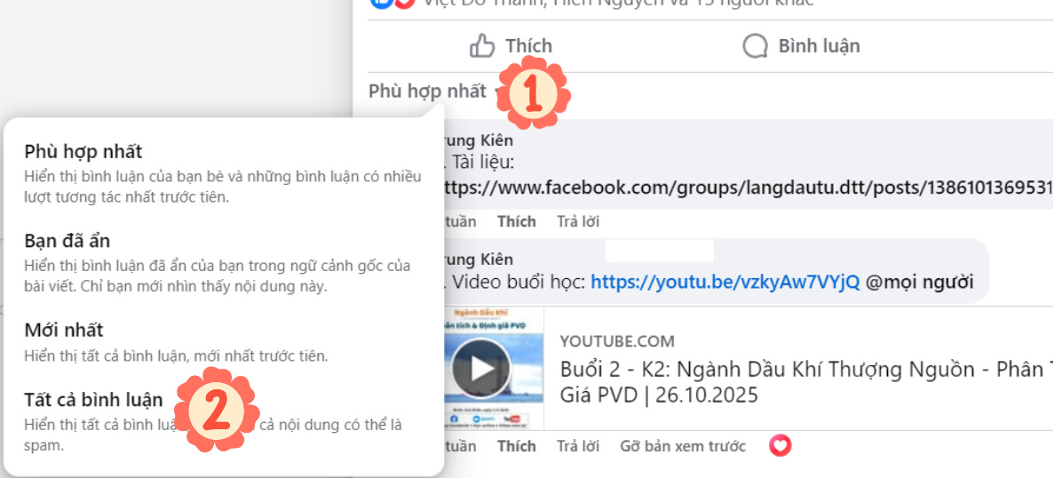 Nếu ACE bận không tham gia học online thì có thể xem lại video và tài liệu của buổi học được Kiên đăng trên group Học viên sau đó (hình dưới). Khi vào xem, nhớ bấm 1/ Phù hợp nhất → 2/ Tất cả bình luận để Facebook hiện toàn bộ bình luận có chứa link video và tài liệu. Hoặc mọi người có thể cập nhật đường link buổi học trong sheet Toàn bộ như hướng dẫn ở đầu bài viết.