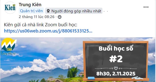 Khoảng 8h25 sáng Chủ Nhật (tức 5 phút trước giờ học), Kiên sẽ gửi link Zoom trong group Làng đầu tư để mọi người bấm vào tham gia đúng giờ, như trong hình minh họa bên dưới.