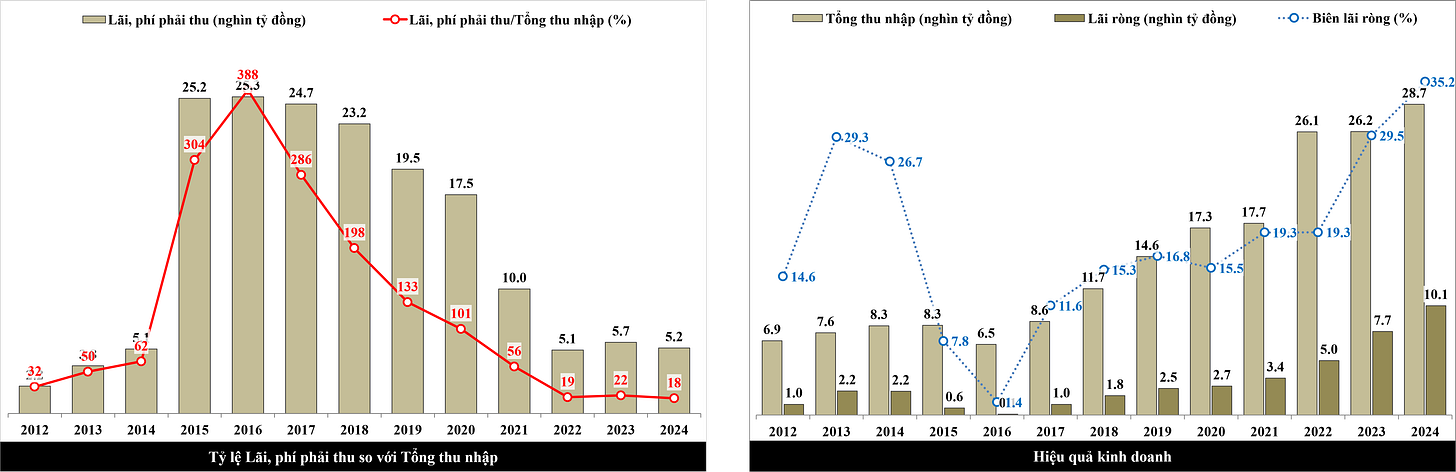 Trong đề án tái cơ cấu giai đoạn 2015 - 2025, STB được phép khoanh số lãi dự thu khổng lồ (chiếm tỷ trọng lớn nhất trong lãi, phí phải thu ở hình trên) vào cuối năm 2015 do sáp nhập với ngân hàng Phương Nam và phân bổ dần vào chi phí hoạt động kinh doanh theo năng lực tài chính trong thời hạn tối đa 10 năm. Từ biểu đồ trên, chúng ta thấy STB đã phân bổ rất mạnh tay lãi dự thu vào chi phí trong năm 2021 và 2022 khiến cho lãi, phí phải thu giảm rất nhanh. Riêng 2022, STB đã phân bổ toàn bộ hơn 5,677 tỷ đồng lãi dự thu còn lại theo đề án tái cơ cấu, đánh dấu bước chuyển mình của ngân hàng sang một trang mới.