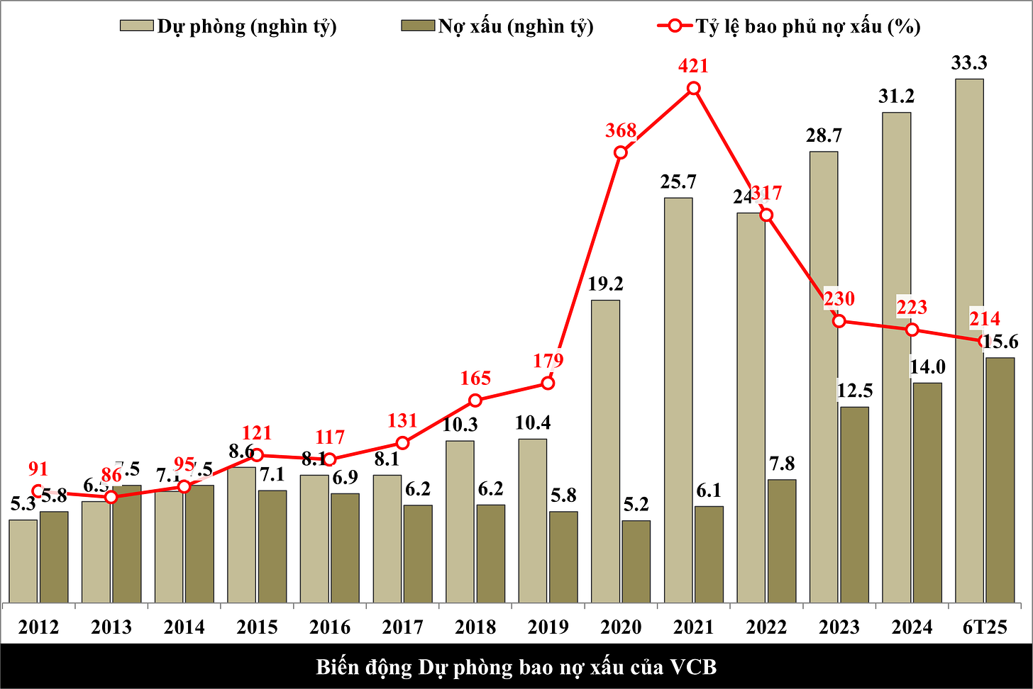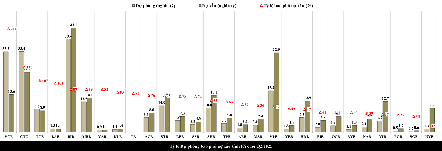 Tính tới cuối Q2.2025, một số ngân hàng nổi bật như VCB, CTG, TCB có tỷ lệ dự phòng bao phủ nợ xấu vượt 100%. Trong buổi chia sẻ với nhà đầu tư gần đây, ban lãnh đạo của MBB cũng quyết tâm dưa tỷ lệ này về lại mức trên 100%.