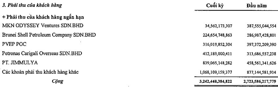 Còn việc gia tăng các khoản phải thu mặc dù vẫn cao nhưng đang có chiều hướng tốt. Cụ thể, mức độ bị chiếm dụng vốn do tăng khoản phải thu trong 9 tháng 2025 đã cải thiện so với cùng kỳ năm trước(từ âm 1,197.5 tỷ đồng xuống còn âm 937.8 tỷ đồng, tức giảm 259.7 tỷ đồng). Ngoài ra, khi kiểm tra thông tin các khách hàng trong khoản mục phải thu thì đều là các tên tuổi lớn trong ngành khai thác dầu khí ở khu vực Đông Nam Á nên chúng ta có thể yên tâm.