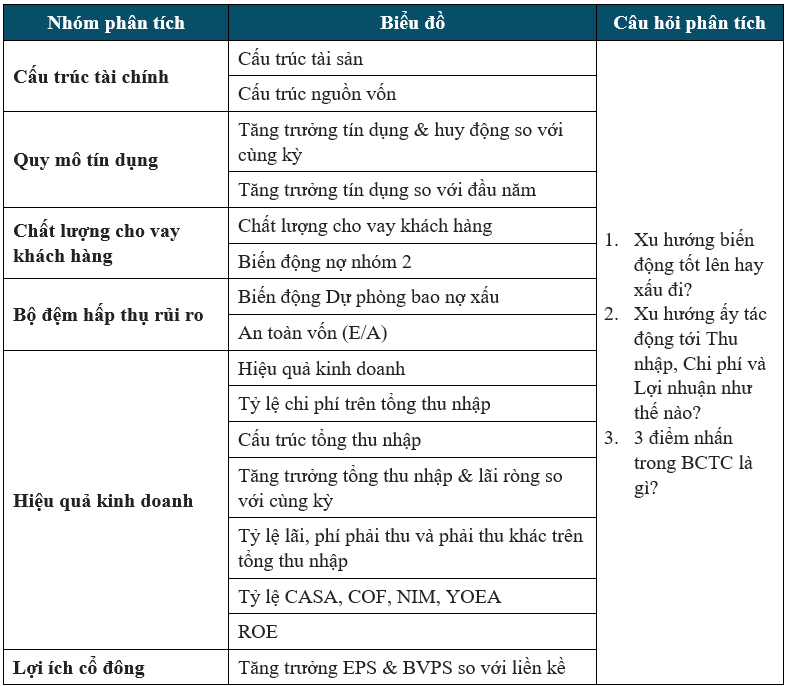 Trình tự phân tích: Cấu trúc tài chính -> Quy mô tín dụng -> Chất lượng cho vay khách hàng -> Bộ đệm hấp thụ rủi ro -> Hiệu quả kinh doanh -> Lợi ích cổ đông.