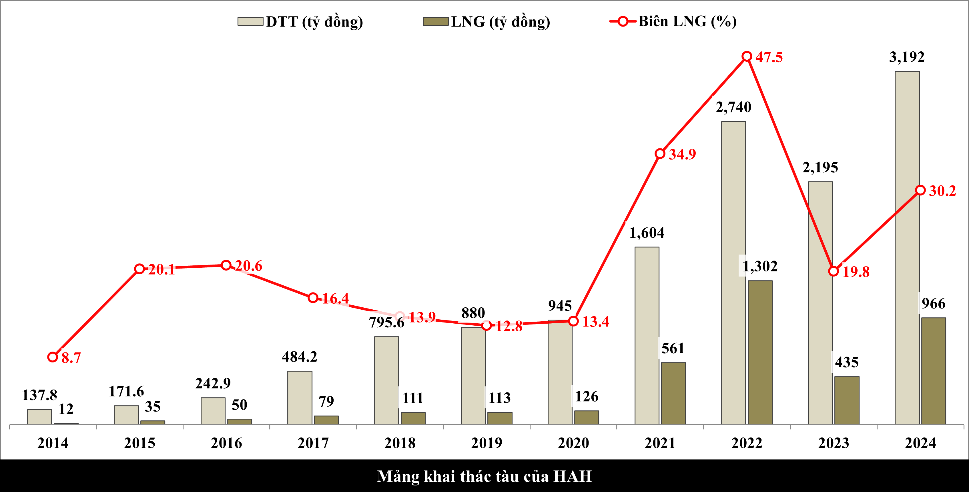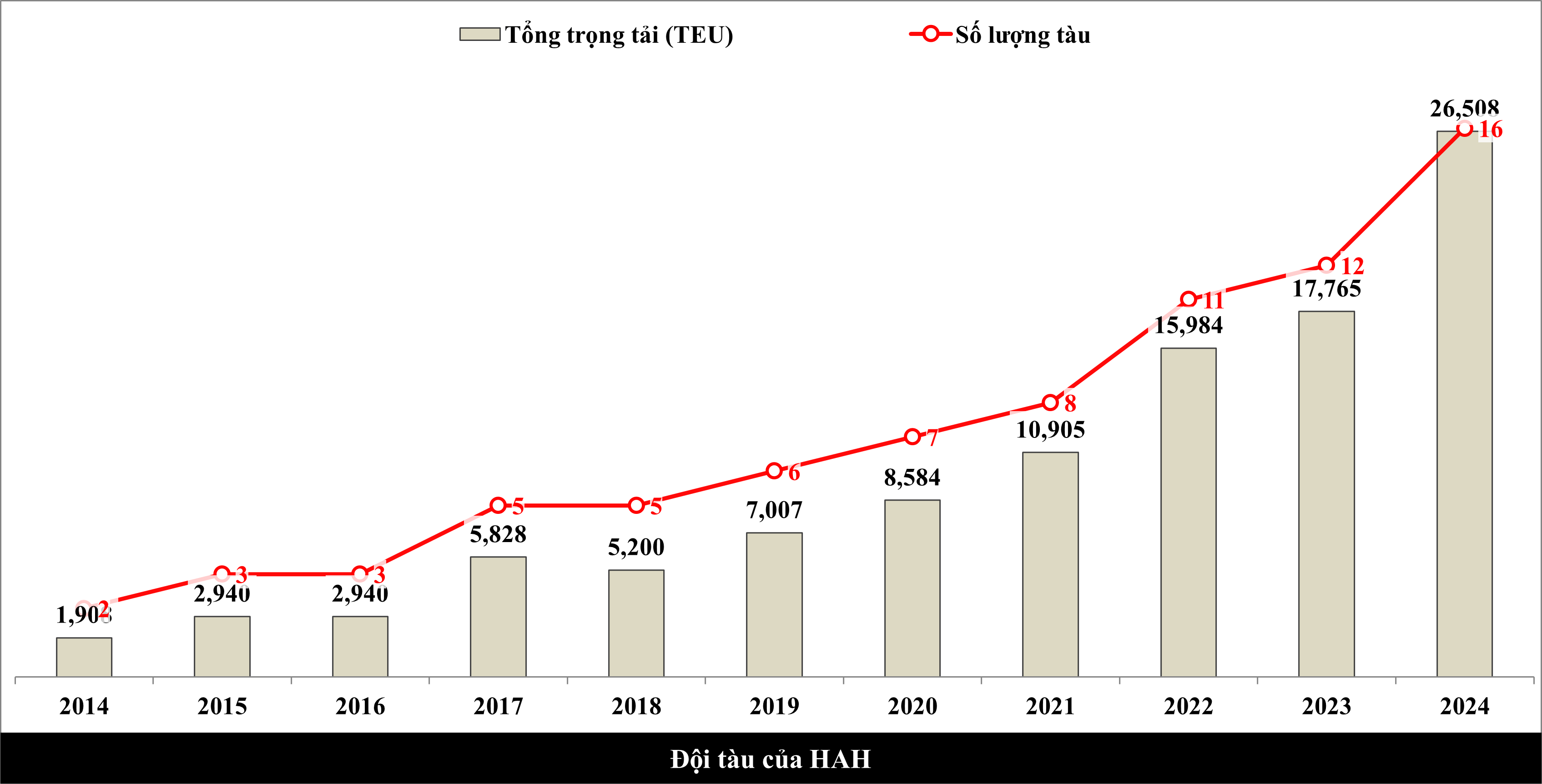 Nguyên nhân bắt đầu từ 2014, ban lãnh đạo HAH thấy được rủi ro cạnh tranh từ cảng nước sâu Lạch Huyện nên đã chuyển hướng mục tiêu kinh doanh sang vận tải biển container thay vì chỉ kinh doanh khai thác cảng. Tính tới cuối năm 2024, đội tàu của HAH có sự tăng trưởng mạnh hơn 3 lần về tổng trọng tải so với cuối năm 2020.